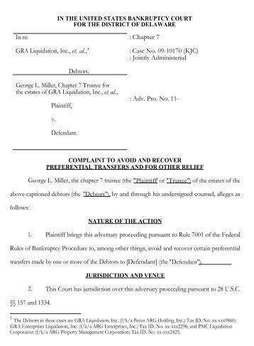 IN THE UNITED STATES BANKRUPTCY COURT FOR THE DISTRICT OF DELAWARE In re: ) Chapter 7 ) Ralph A preference actions under section 547 of the Code. cause.”6 “Whether to reopen a closed bankruptcy case is committed to the discretion of ... Read Full Source